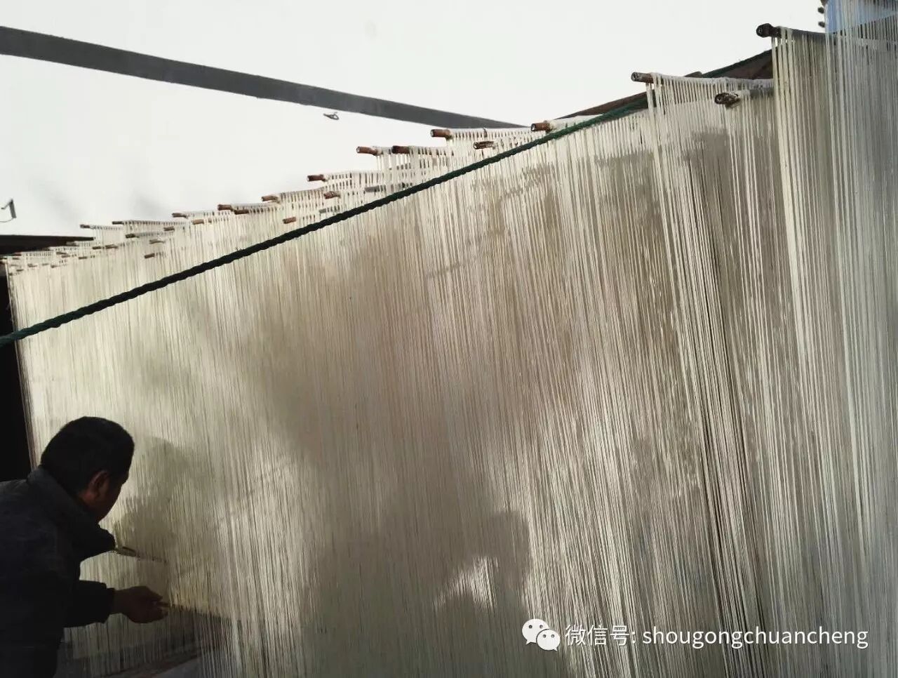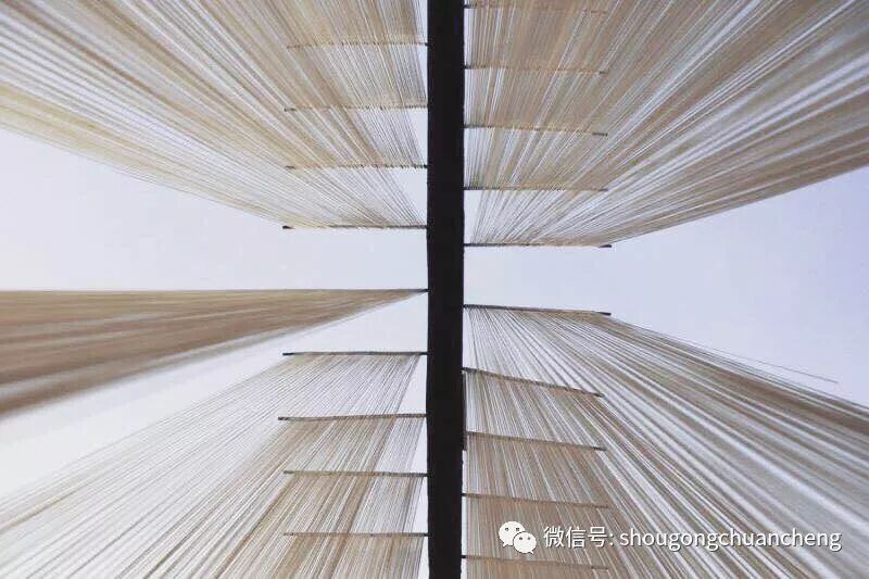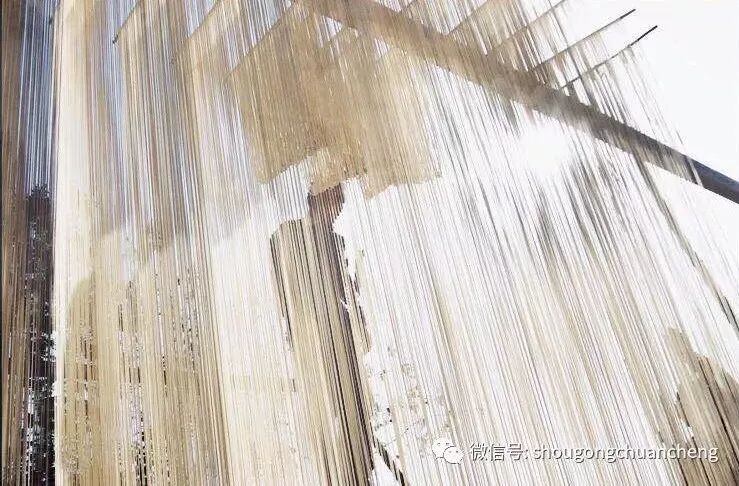 丝面这种普通的食物,也许你经常在超市商店见到一袋袋,一捆捆包装好的成品,但你或许从未想到手工丝面的制作过程也那么美,一排排晾晒的丝面如琴弦般弹拨在付德洲的手中,这一刻你才发现质朴跟优雅还能结合的如此完美。
