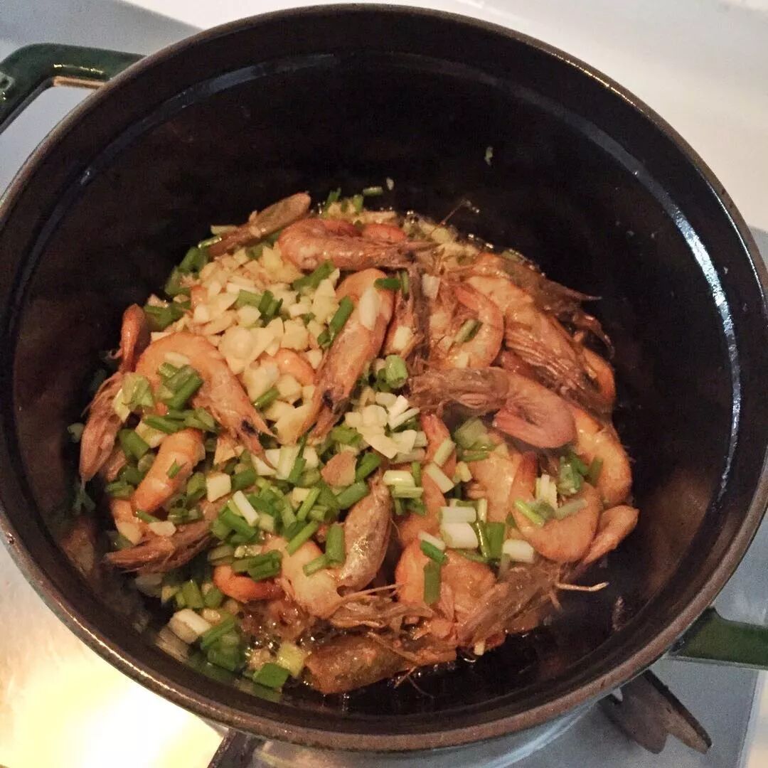 翻炒到红虾8、9分熟之后,放入切好的葱姜蒜末,加点盐,继续翻炒,直到闻到葱蒜的香味。