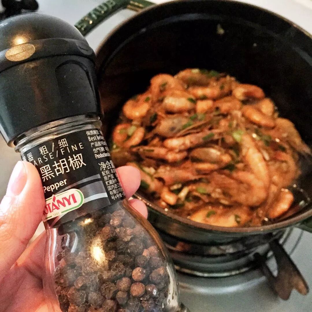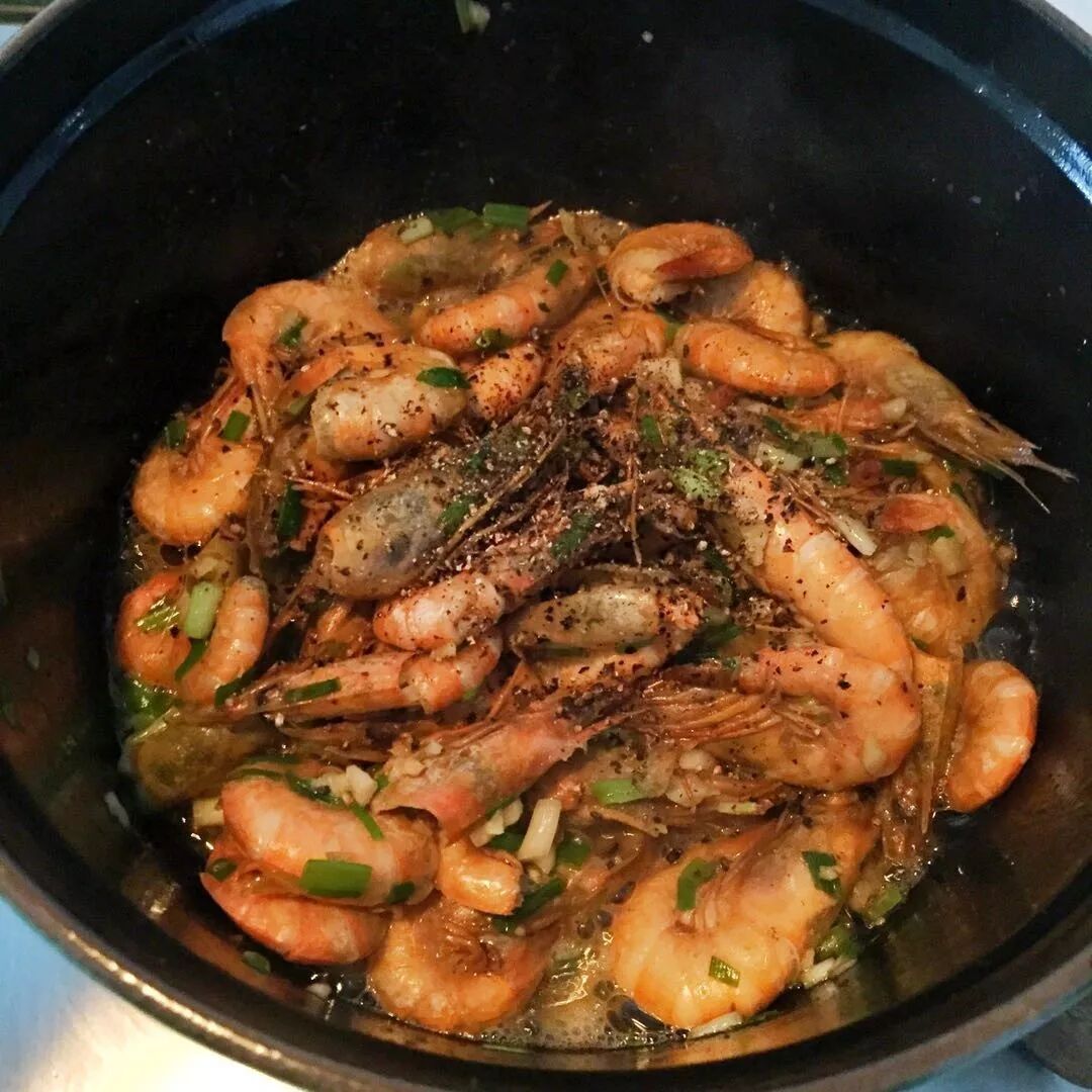 研磨的黑胡椒末被加热后,会出来椒香,混着虾和葱蒜的清香,这个时候就好了,可以关火上桌了。