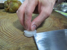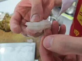 2.将虾仁开背,取出虾线,把水分用毛巾吸干。