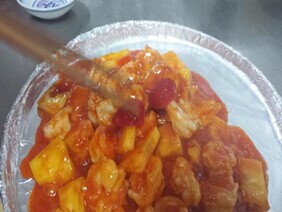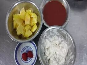 准备材料:虾仁150克、菠萝小片180克(2.5厘米宽,1厘米厚)、草莓2个、汁水200克。