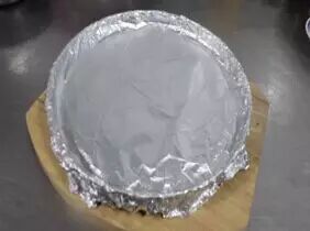 6.提前在容器底部铺上锡箔纸,炒好的虾仁装入(菠萝放底部,虾仁放表面)虾仁表面放草莓1个(草莓切成2半)即可。