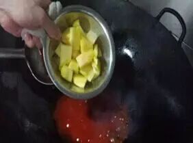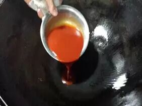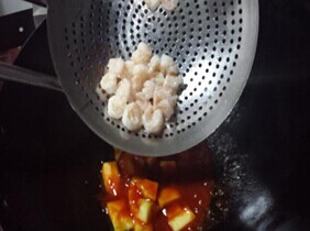 5.锅洗净烧热锅中倒入汁水,中火烧开,加入菠萝片、倒入滑好油的虾仁一起拌匀。