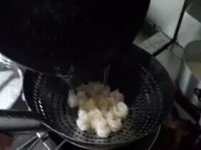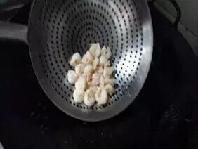 4.锅洗净烧热,下干净色拉油,将油温烧至3成,放入裹好蛋清糊的虾仁,进行滑油,虾仁5-6成熟时,可倒出控油备用。