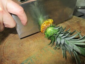 1.菠萝去头 (切成宽2.5厘米、厚1厘米的块状)备用。