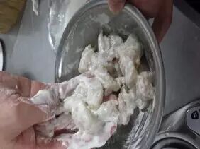 3.将蛋清糊和虾仁一起搅拌均匀(150克虾仁加蛋清糊20克)。