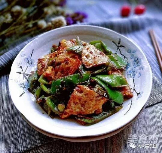 7.锅中入少许油,将青椒下入煸至虎皮状后盛起备用;