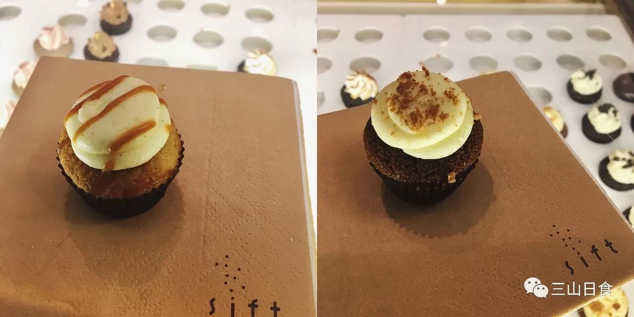 逛到希慎广场时肚子饿得开始抗议,路过一家卖cupcake的店铺有售卖一口一个的mini款,和朋友一人来了一个,分别是肉桂味和香蕉味,topping原来不是cream而是奶酪,酸酸甜甜的一点儿也不腻,配上底部蛋糕湿湿润润口感很不错。mini的size让人感觉刚刚好,既满足想吃甜点的胃也不会吃到腻,还可以尝试到多种口味。地址是在希慎的二楼扶手电梯旁,名字没有注意,应该是sift。