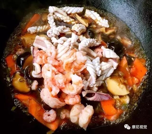 这道小吃是用凉粉做出来的,先用平底锅把凉粉煎好了,再把炒好的海鲜和蒜泥啊、芝麻酱啊、酱油啊、醋啊这些辅料放进去,然后就做好了。