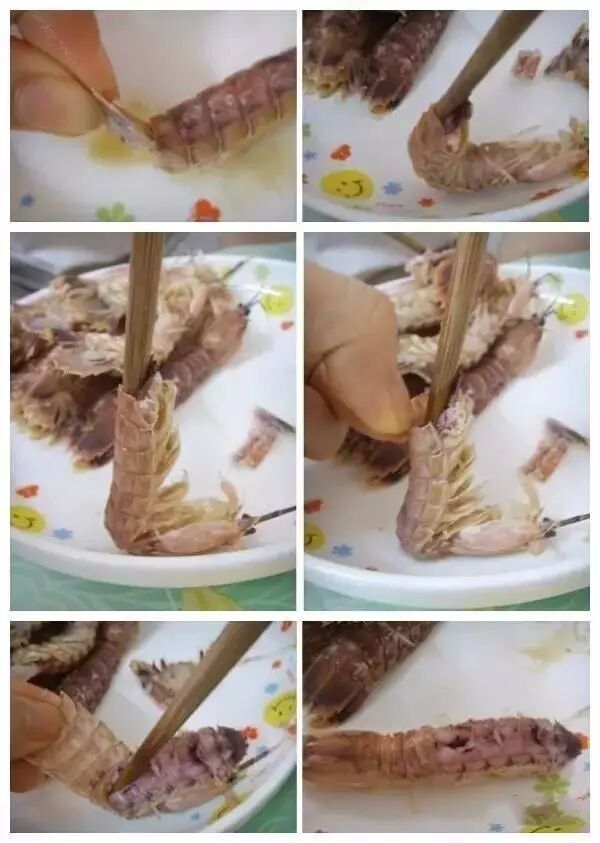 先把尾部最外面两个小脚拧断,然后捏着尾部轻轻往上一折,再拧掉,尾巴上的肉就出来了。随后,用根筷子从尾部贴着虾壳插到头附近,左手把壳折开,右手按筷子,两手同时反方向用力,背部整个壳就掀开了。