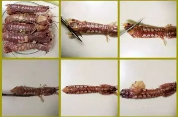 用剪刀沿着皮皮虾的一侧背部和腹部的结合处一路剪下去,然后再剪另一侧,之后轻轻一揭,一个完整的皮皮虾肉就出现在你面前了。