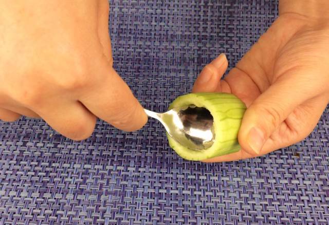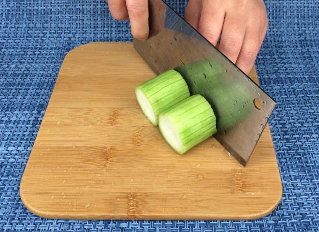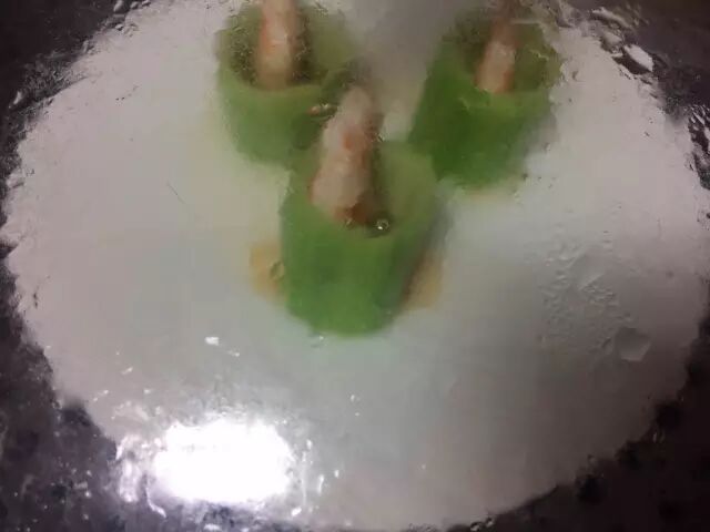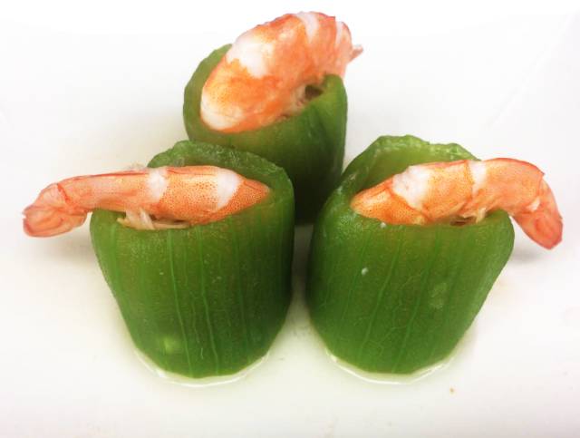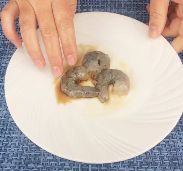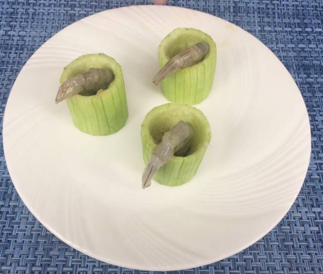 准备食材,丝瓜去皮切段,中间的瓤挖掉不要挖空,虾去头挑线留尾
