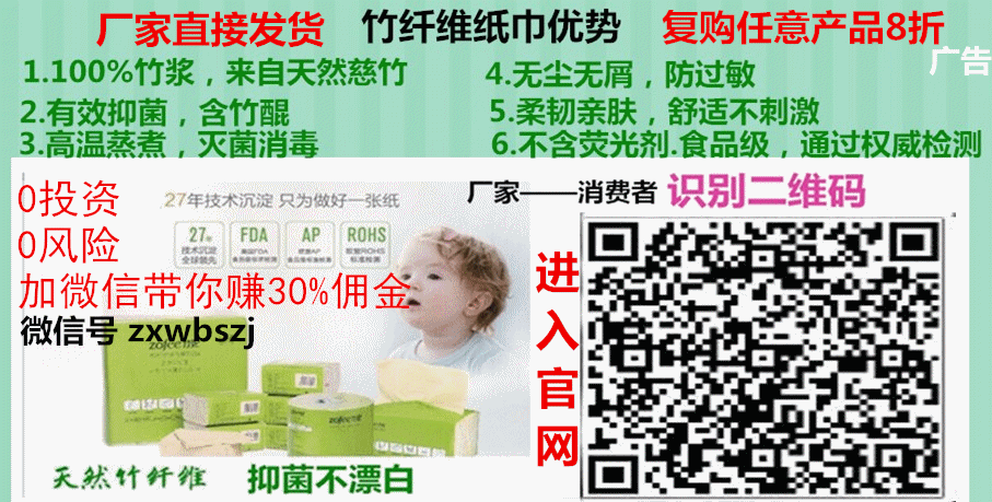 首次购买一箱竹纤维健康纸巾,快递送到家,复购8折(抽纸3.96/包),得到健康,得到实惠!你还可以免费成为全国代理,一个二维码开启创业之路,走到哪里扫到哪里,不囤货不收钱不发货,公司为你解决。手机商城下单,厂家直接发货!利用碎片时间赚取公司给的广告费!平常我们在某商场买了件漂亮的衣服都要告诉身边的人去购买,商场不会给我们任何好处,但是你告诉别人你用上健康竹纤维纸巾让身边的人去购买,公司就会给你广告费!以后朋友的朋友下半辈子用的竹妃纸巾你都有公司给的广告费!