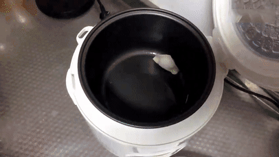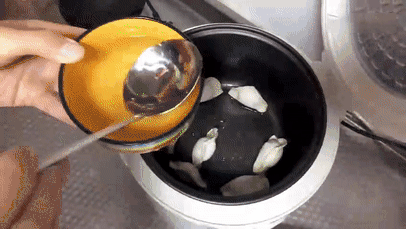 3、往电饭锅里加清水,水量大致到饺子的1/3即可。