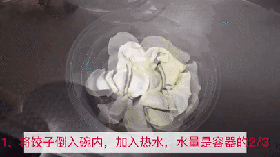 1、将饺子倒入微波炉专用碗,加入热水,水量大致到达碗的2/3。