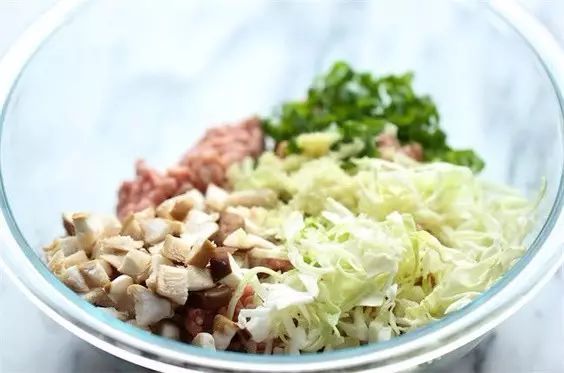 1、在一个碗里,加入肉末、包菜碎、香菇丁、蒜末、小葱末、姜碎、芝麻油和白胡椒,朝同一个方向拌匀。