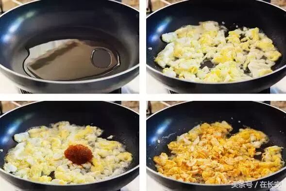 还有一种是先炒鸡蛋再炒米饭。在打鸡蛋的时候,可以加点水或者两滴醋,炒的时候会更蓬松一些。搅拌的时候顺着一个方向打,不要打出太多泡沫,炒出来的蛋就是漂亮的金黄色了。